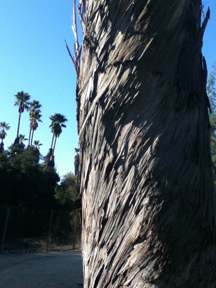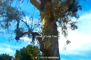 Next, I am struck by the nearby presence of a giant 200 foot tall tree, located about 33 yards behind the monument and fronting the the 170 freeway. Patting the bark of this vortex tree, I grin, satisfied that this is a perfect transmitter tree for the 11/01/10 meditation.
