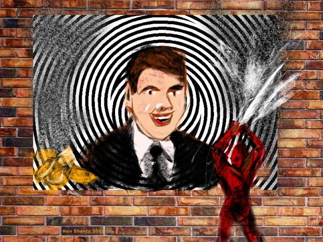 The game show host appeared on the family room TV.  The hypno wheel spun behind him as he laughed wickedly.   Gloria and the kids went into a trance.  “This can all be real, again Ken.  You can be rich and young again, be with your family.  Simply lay down the sword.”