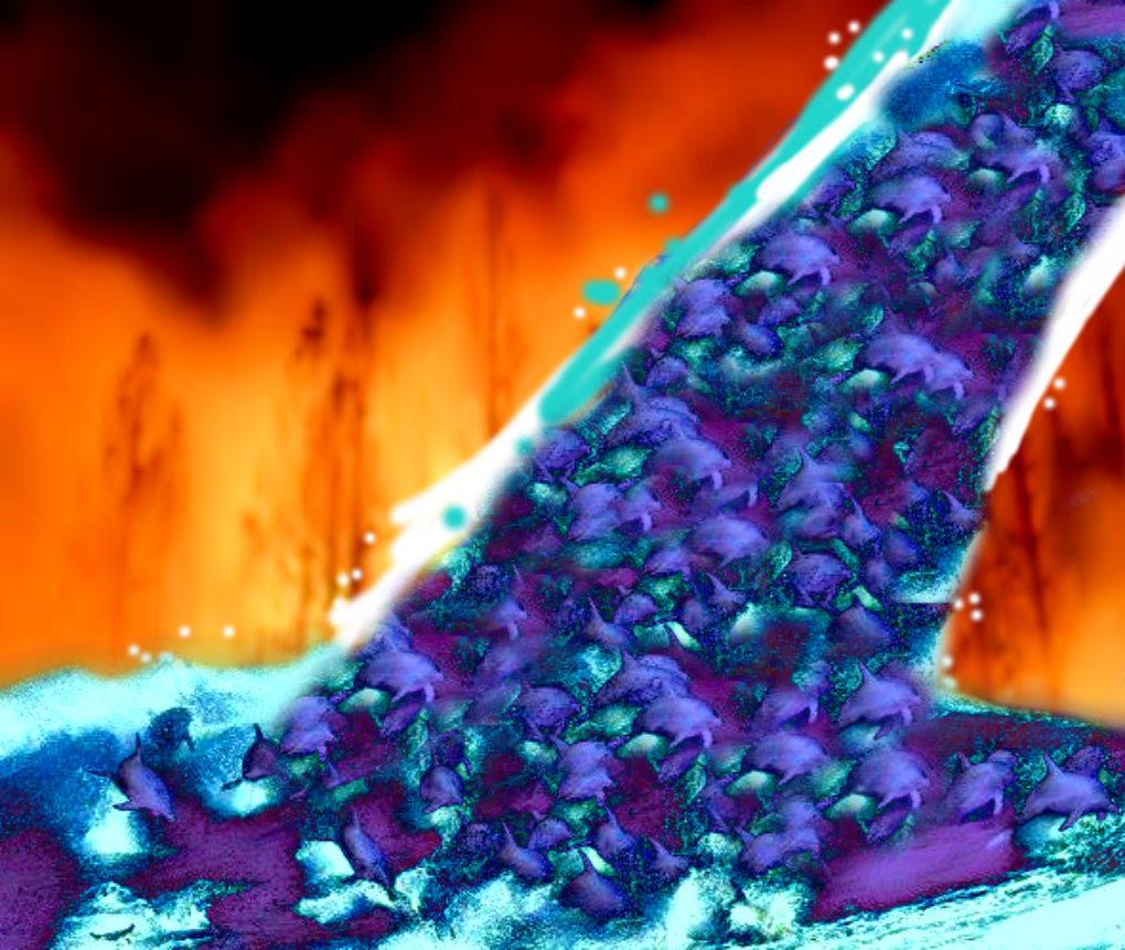 At last the Atlantic waters of the wand finally reaches the fires of California raging outside San Fransisco. A team of electric dolphins leap from the Pacific, grateful for the Fukushima meditations, join the Atlantic waters and pull a wave of the water soaring into the wall of flame. Living redwoods join to battle the fire by diverting rivers. It’s more epic the LTOR. And the fire dies in a cloud of steam.
