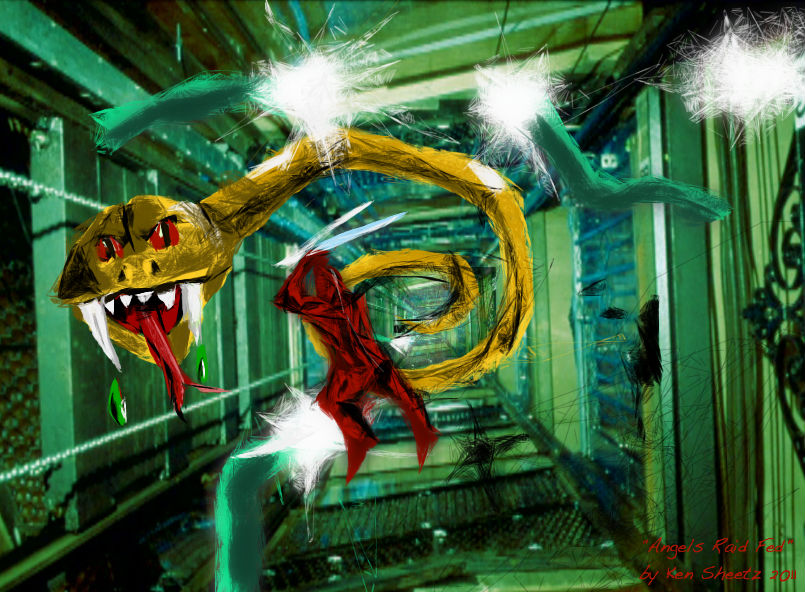 By the freshness that flowed in the dank elevator shaft I knew angels were near. Bogey flew past as he took aim at the great serpent. “Because Sheetz is already dead and now, snake, so are you!” The angels opened fire and the snake vaporized in a hail of angelic fire.